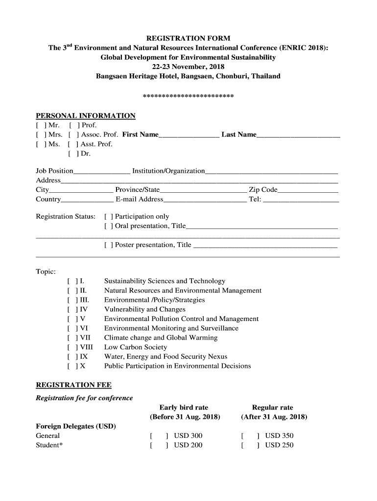 REGISTRATION FORM The 3 Environment and Natural Resources International Conference (ERIC 2018): Global Development for Environmental Sustainability 2223 November 2018 Bandsmen Heritage Hotel, Bandsmen,