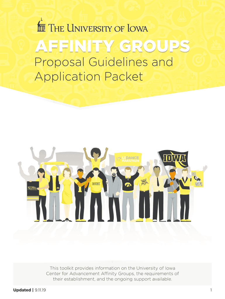 AFFINITY GROUPSAFFINITY GROUPSProposal Guidelines and Application Packet2018This toolkit provides information on the University of Iowa Center for Advancement Affinity Groups, the requirements of