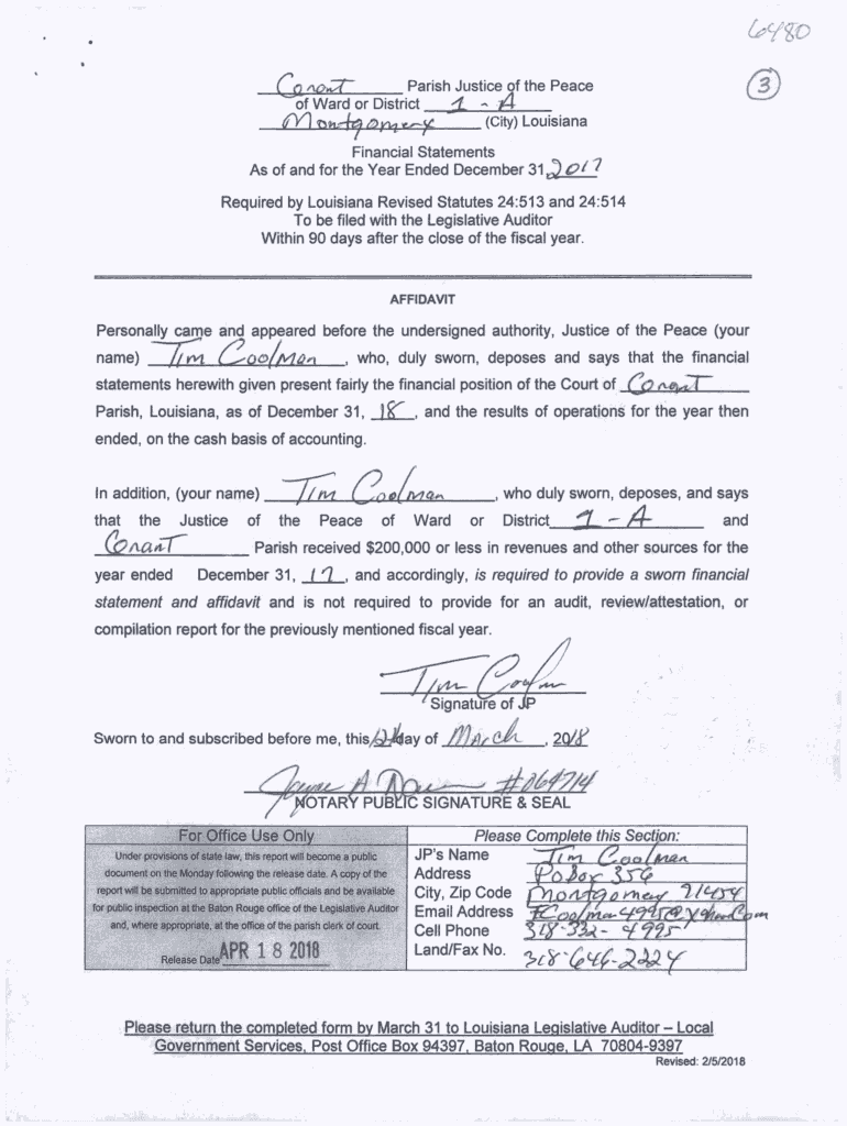 C /out Parish Justice of the Peace of Ward or District 4 (City) Louisiana Financial Statements As of and for the Year Ended December 31 Required by Louisiana Revised Statutes 24:513 and 24:514 To