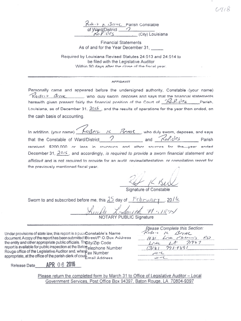 3C7 'C Paris Constable of W d/District O CR 'DES (City) Louisiana Financial Statements As of and for the Year December 31, Required by Louisiana Revised Statutes 24:513 and 24:514 to be filed with