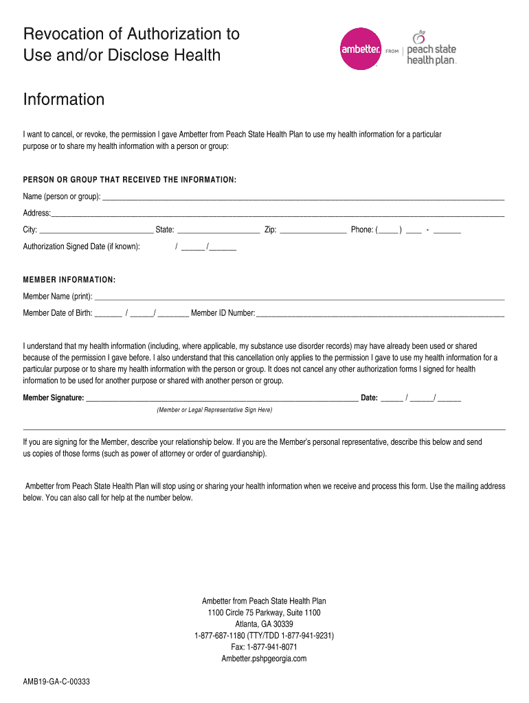 Revocation of Authorization to Use and/or Disclose Health Information I want to cancel, or revoke, the permission I gave Am better from Peach State Health Plan to use my health information for a particular