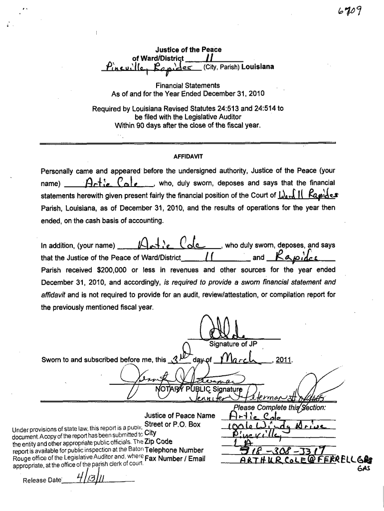 ('p 'i Justice of the Peace of Ward/District I Am 'u. 'Of)9, V(g (City. Parish) Louisiana Financial Statements As of and for the Year Ended December 31, 2010, Required by Louisiana Revised Statutes