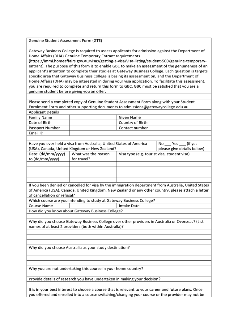 Get the free Genuine Student Assessment Form (GTE)
