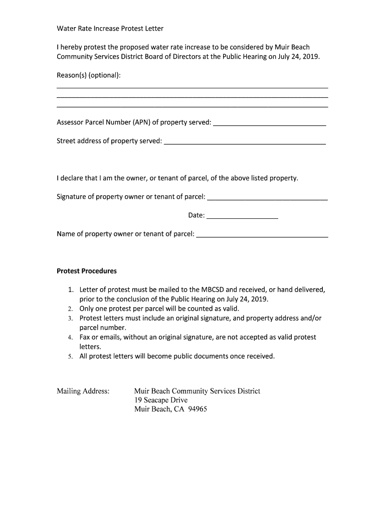 Water Rate Increase Protest Letter I hereby protest the proposed water rate increase to be considered by Muir Beach Community Services District Board of Directors at the Public Hearing on July 24,