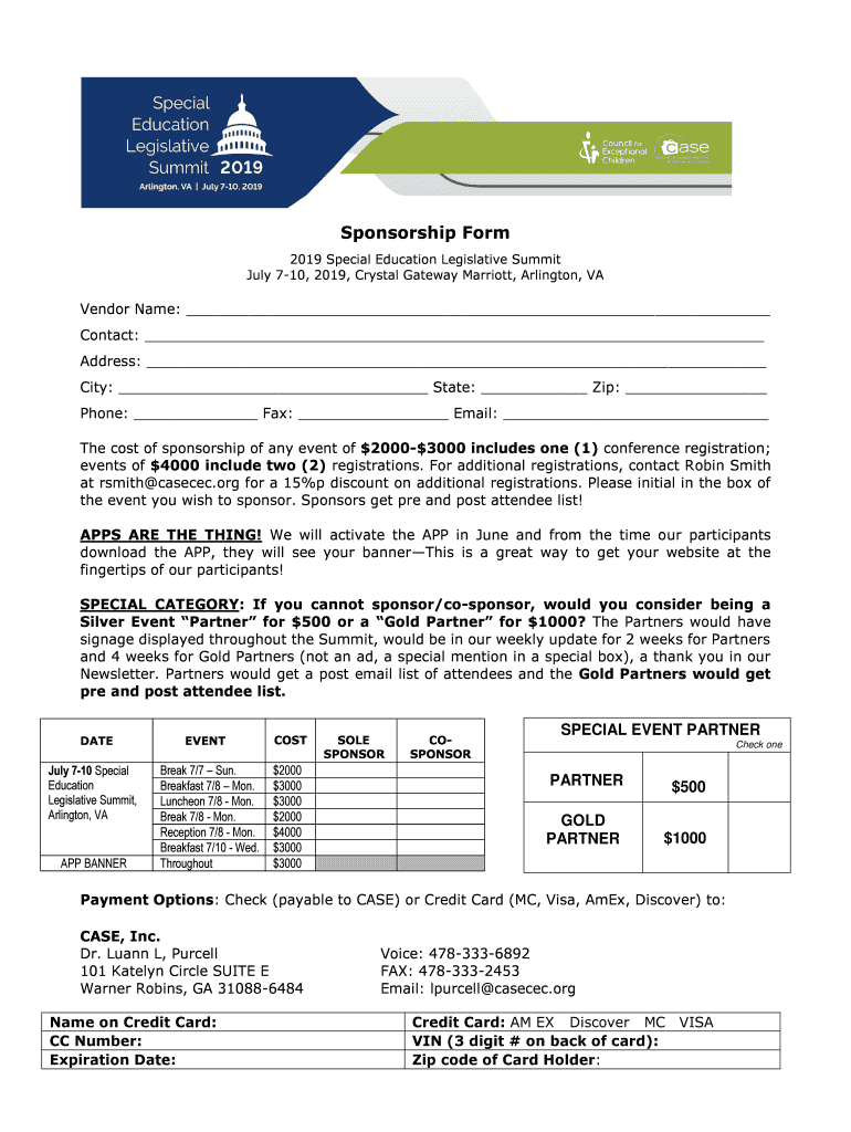 Sponsorship Form 2019 Special Education Legislative Summit July 710, 2019, Crystal Gateway Marriott, Arlington, Vendor Name: Contact: Address: City: State: Zip: Phone: Fax: Email: The cost of sponsorship