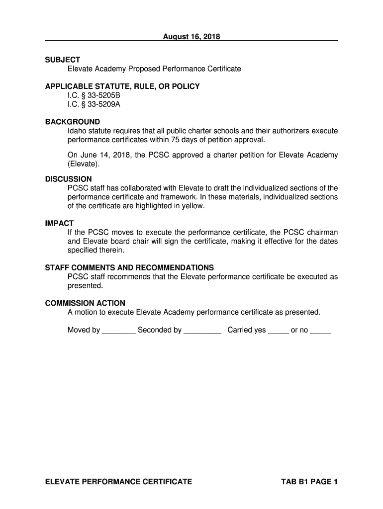 August 16, 2018, SUBJECT Elevate Academy Proposed Performance Certificate APPLICABLE STATUTE, RULE, OR POLICY I.C. 335205B I.C. 335209A BACKGROUND Idaho statute requires that all public charter schools