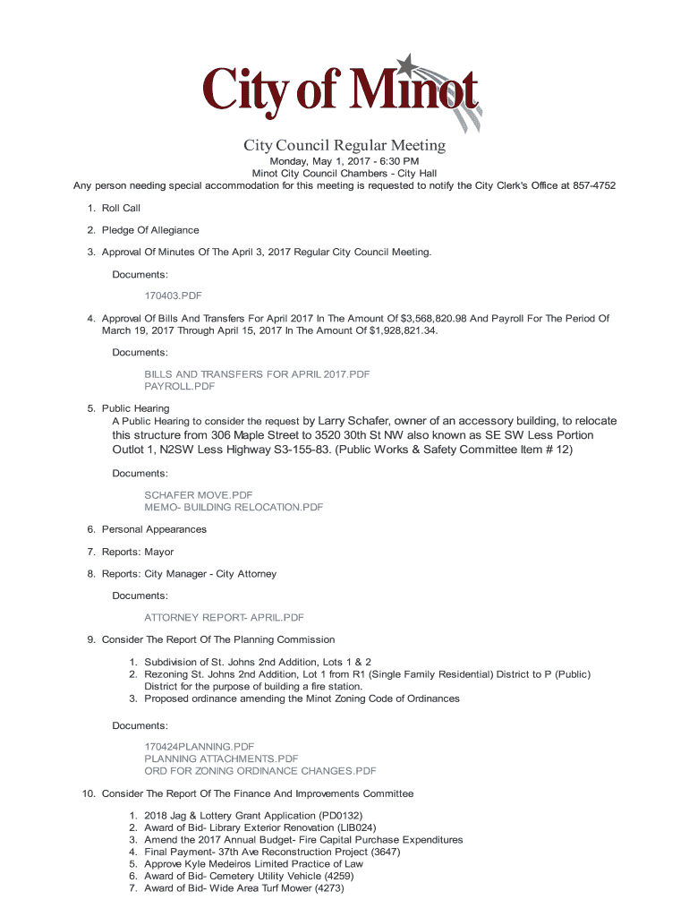 City Council Regular Meeting Monday, May 1, 2017 6:30 PM Minot City Council Chambers City Hall Any person needing special accommodation for this meeting is requested to notify the City Clerk's Office