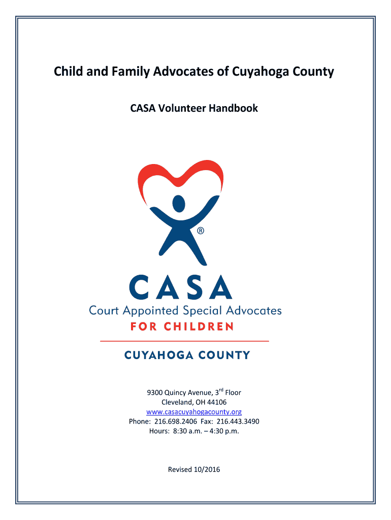 Child and Family Advocates of Cuyahoga County CASA Volunteer Handbook9300 Quincy Avenue, 3rd Floor Cleveland, OH 44106 www.casacuyahogacounty.org Phone: 216.698.2406 Fax: 216.443.3490 Hours: 8:30