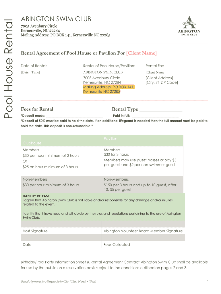 Pool House RentalABINGTON SWIM CLUB 7005 Amesbury Circle Kernersville, NC 27284 Mailing Address: PO BOX 141, Kernersville NC 27285Rental Agreement of Pool House or Pavilion For Client Name Date of