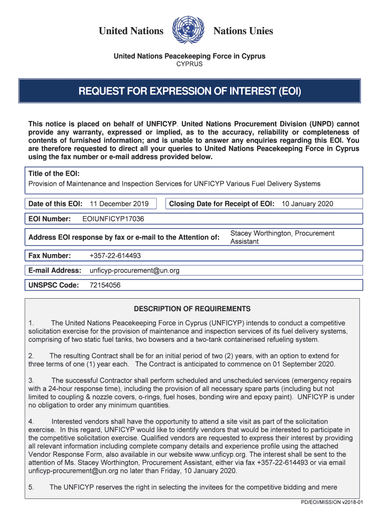 This notice is placed on behalf of UNITY. United Nations Procurement Division (NPD)