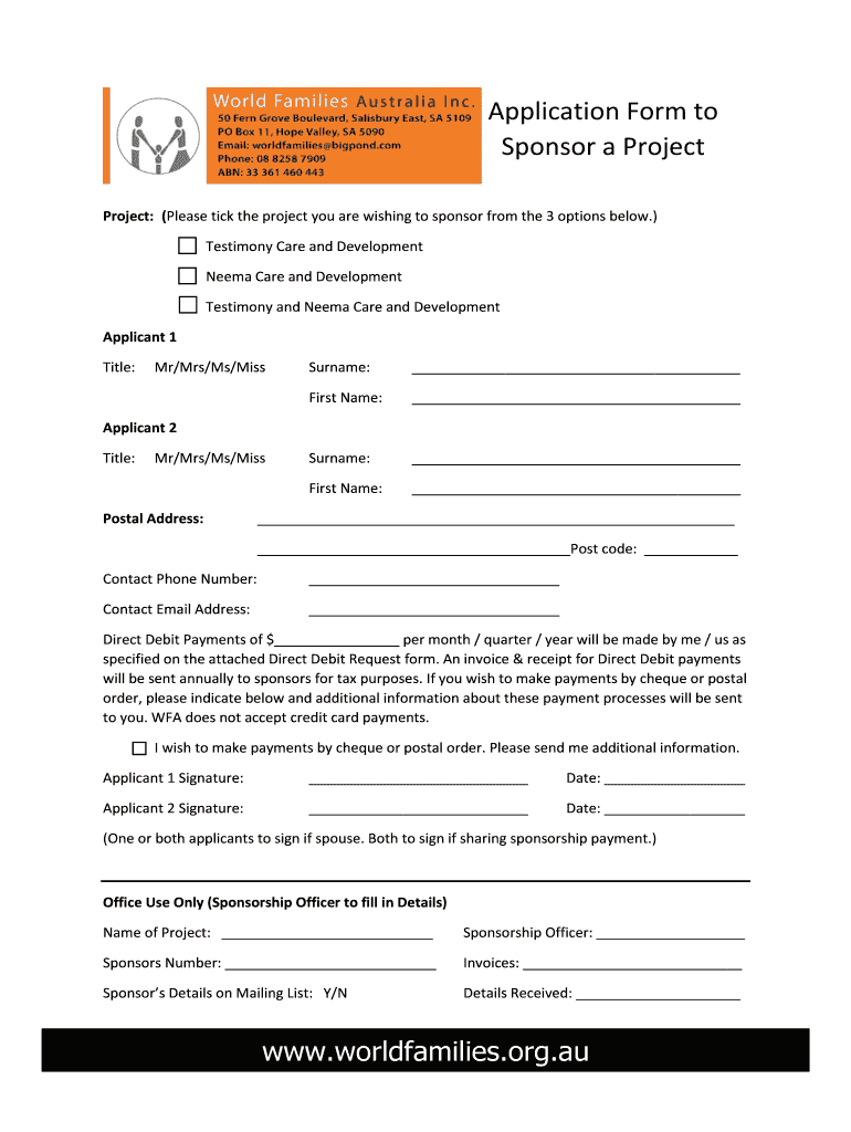 Application Form to Sponsor a Project: (Please tick the project you are wishing to sponsor from the 3 options below.) Testimony Care and Development Neema Care and Development Testimony and Neema