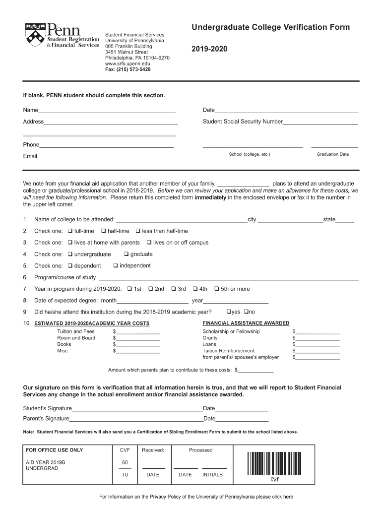 Undergraduate College Verification FormStudent Financial Services University of Pennsylvania 005 Franklin Building 3451 Walnut Street Philadelphia, PA191046270 www.srfs.upenn.edu Fax: (215) 573542820192020If