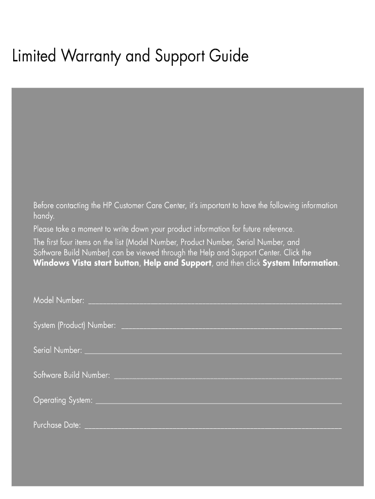 Limited Warranty and Support GuideBefore contacting the HP Customer Care Center, it's important to have the following information handy. Please take a moment to write down your product information