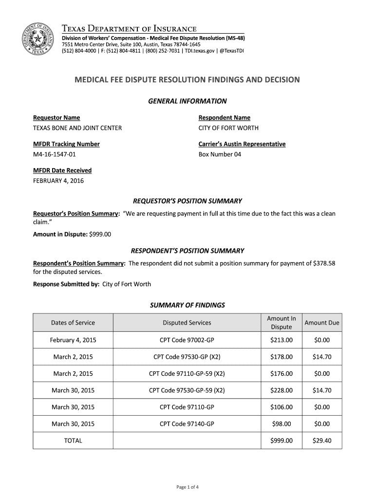 MEDICAL FEE DISPUTE RESOLUTION FINDINGS AND DECISION