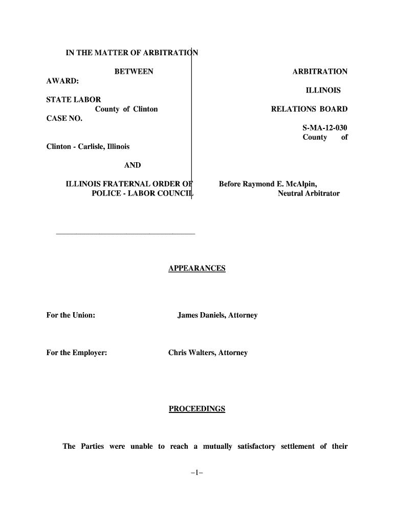 IN THE MATTER OF ARBITRATION BETWEENARBITRATIONAWARD: ILLINOIS STATE LABOR County of Clinton CASE NO.RELATIONS BOARD SMA12030 County of Clinton Carlisle, Illinois AND ILLINOIS FRATERNAL ORDER OF POLICE