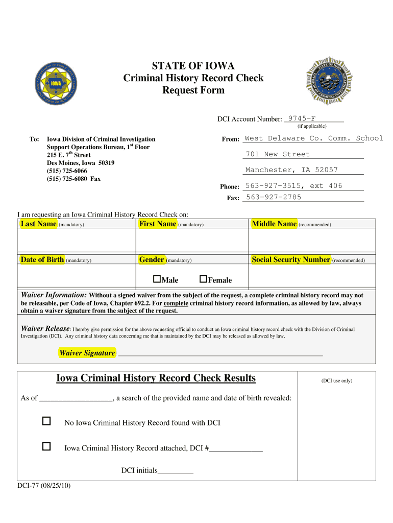 STATE OF IOWA Criminal History Record Check Request Form 9745F DCI Account Number: (if applicable)To:From: West Delaware Co. Comm. School Iowa Division of Criminal Investigation Support Operations