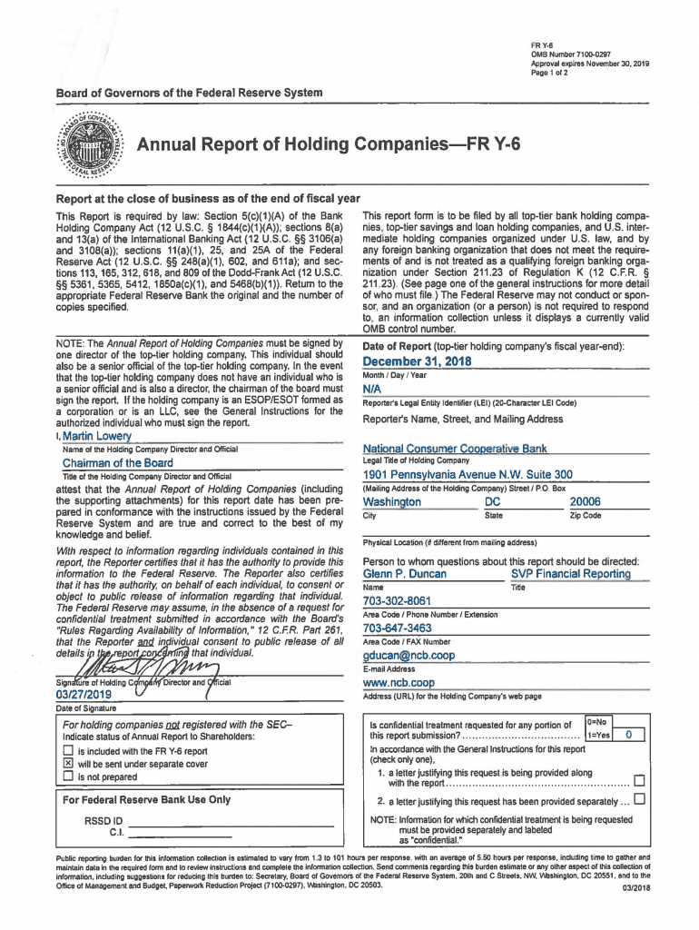 FRY6 0 MB Number 71000297 Approval expires November JO. 2D19 Page 1 of2Board of Governors of the Federal Reserve Systematical Report of Holding Companies FR Y6 Report at the close of business as