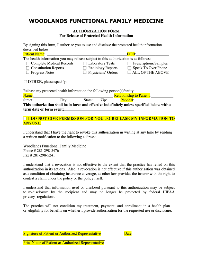 WOODLANDS FUNCTIONAL FAMILY MEDICINE AUTHORIZATION FORM For Release of Protected Health Information By signing this form, I authorize you to use and disclose the protected health information described