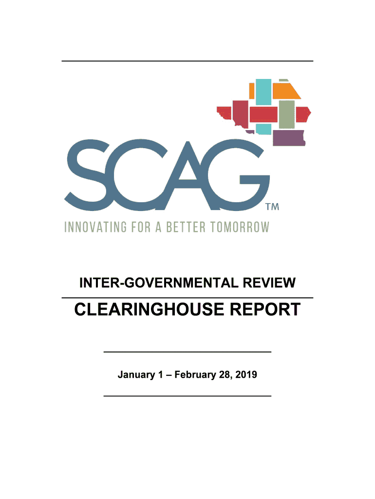 INTERGOVERNMENTAL REVIEW CLEARINGHOUSE REPORT January 1 February 28, 2019, SCAG Clearinghouse Report: Documents Received: 1/1/2019 2/28/2019SOUTHERN CALIFORNIA ASSOCIATION OF GOVERNMENTSINTERGOVERNMENTAL