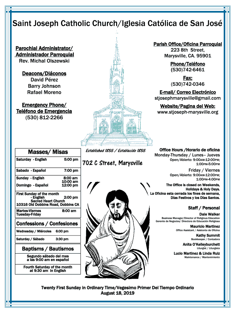 Saint Joseph Catholic Church/Iglesias Catalina de San Jo's Parish Office/Official Parochial 223 8th Street, Marysville, CA. 95901Parochial Administrator/ Administrator Parochial Rev. Michael OlszewskiPhone/Teflon