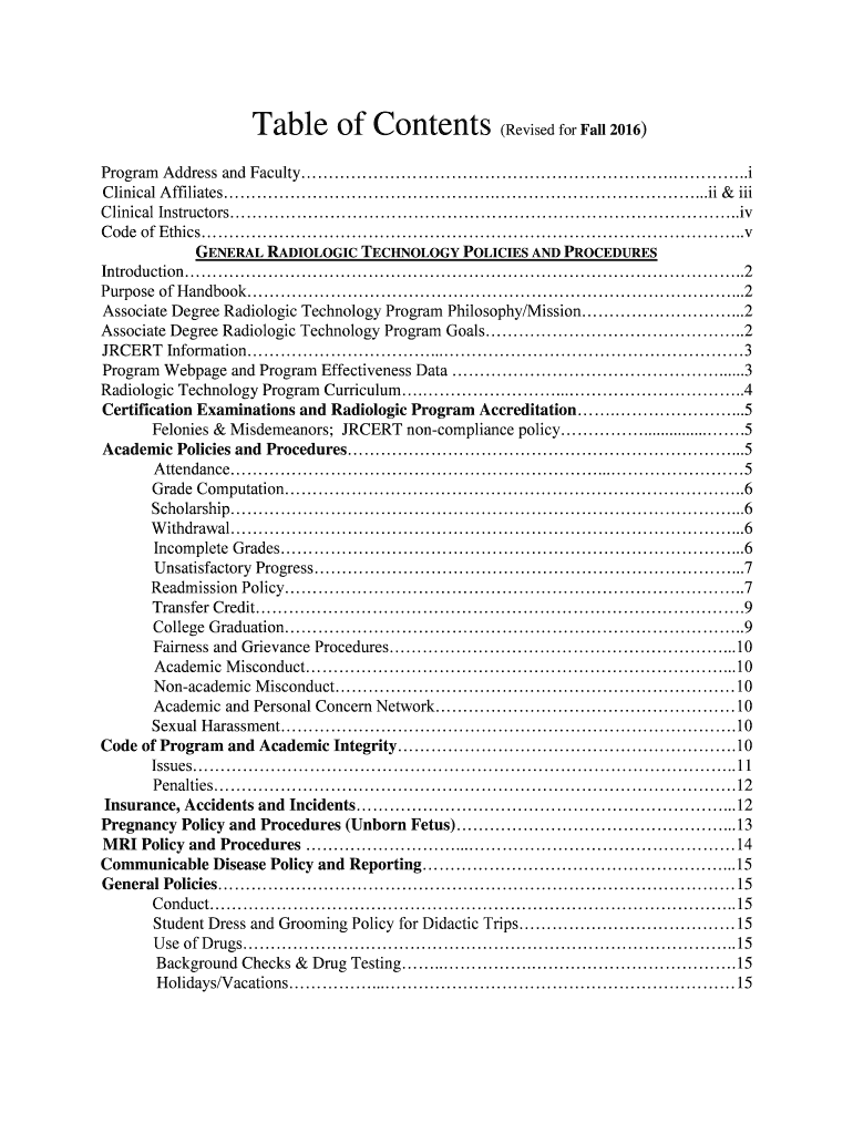 Table of Contents (Revised for Fall 2016) Program Address and Faculty...i Clinical Affiliates....ii & iii Clinical Instructors. Iv Code of Ethics.v GENERAL.