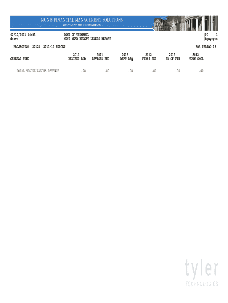 02/10/2011 14:53 save PROJECTION: 20121 TOWN OF TRUMBULL NEXT YEAR BUDGET LEVELS REPORT PG 1 bgnyrpts201112 BUDGET PERIOD 132010 2011 2012 2012 2012 2012 GENERAL FUND REVISED BUD DEPT REQ FIRST SEL
