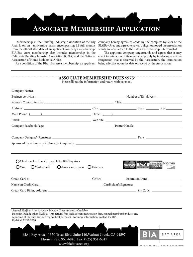Associate Membership Application Membership in the Building Industry Association of the Bay Area is on an anniversary basis, encompassing 12 full months from the official start date of an applicant