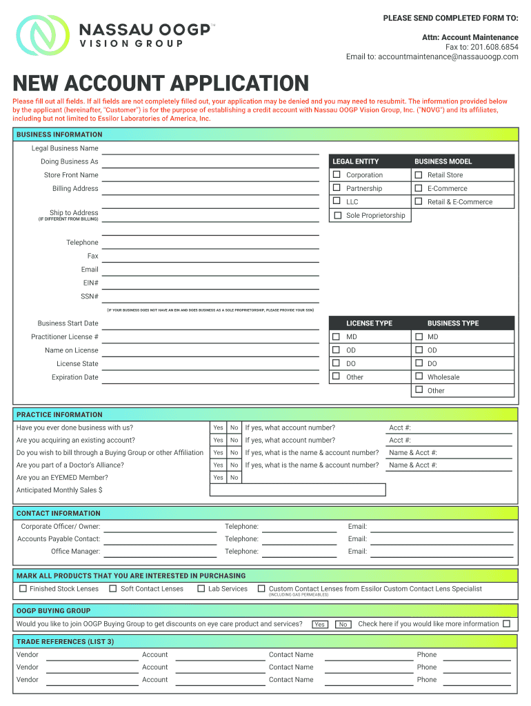 PLEASE SEND COMPLETED FORM TO: Attn: Account Maintenance Fax to: 201.608.6854 Email to: account maintenance nassauoogp. Come ACCOUNT APPLICATIONPlease fill out all fields. If all fields are not completely