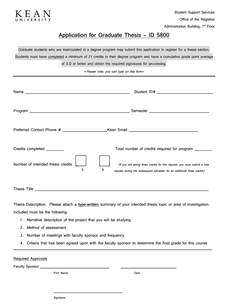 Student Support Services Office of the Registrar Administration Building, 1st FloorApplication for Graduate Thesis ID 5800 Graduate students who are matriculated in a degree program may submit this