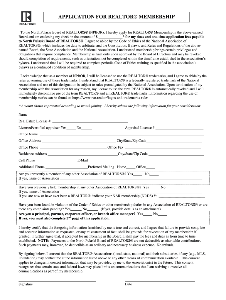 APPLICATION FOR REALTOR MEMBERSHIP Realtor the North Pulaski Board of REALTORS (POOR), I hereby apply for REALTOR Membership in the above named Board and am I enclosing my check in the amount of $