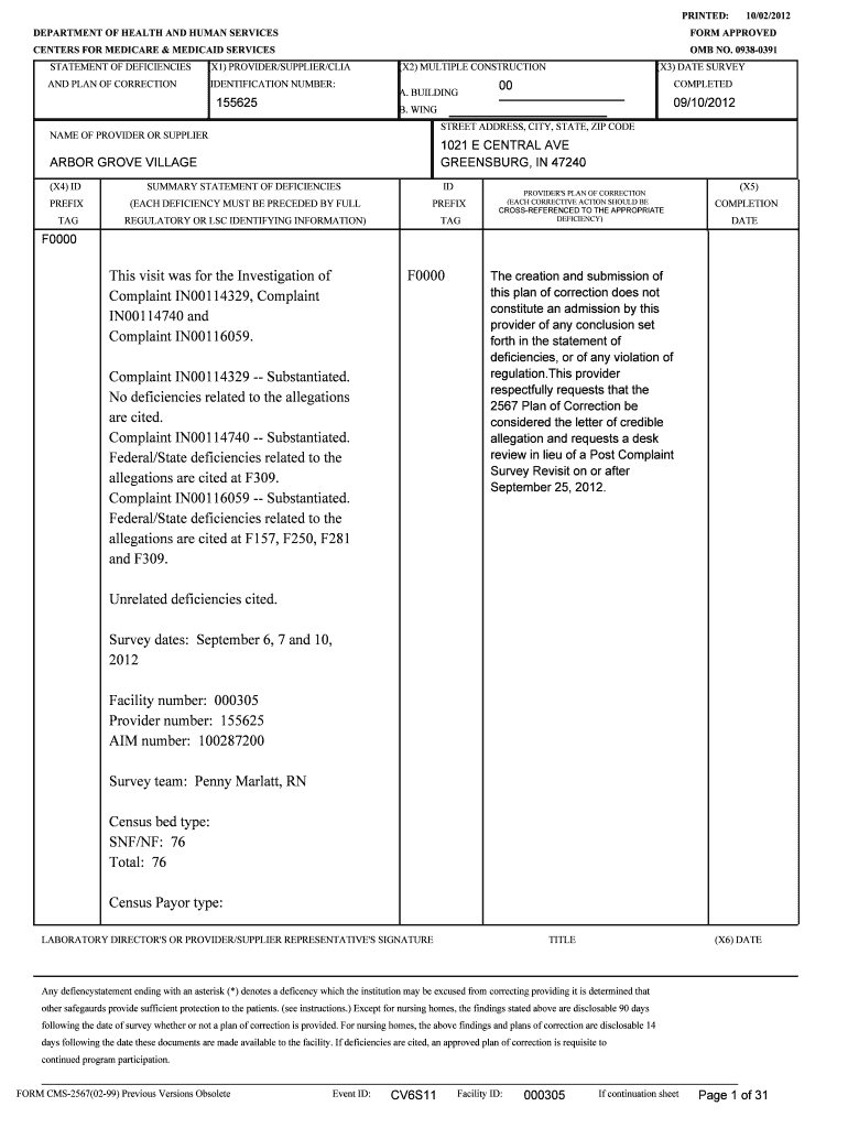 Get the free F0000 This visit was for the Investigation of Complaint IN00114329 ...