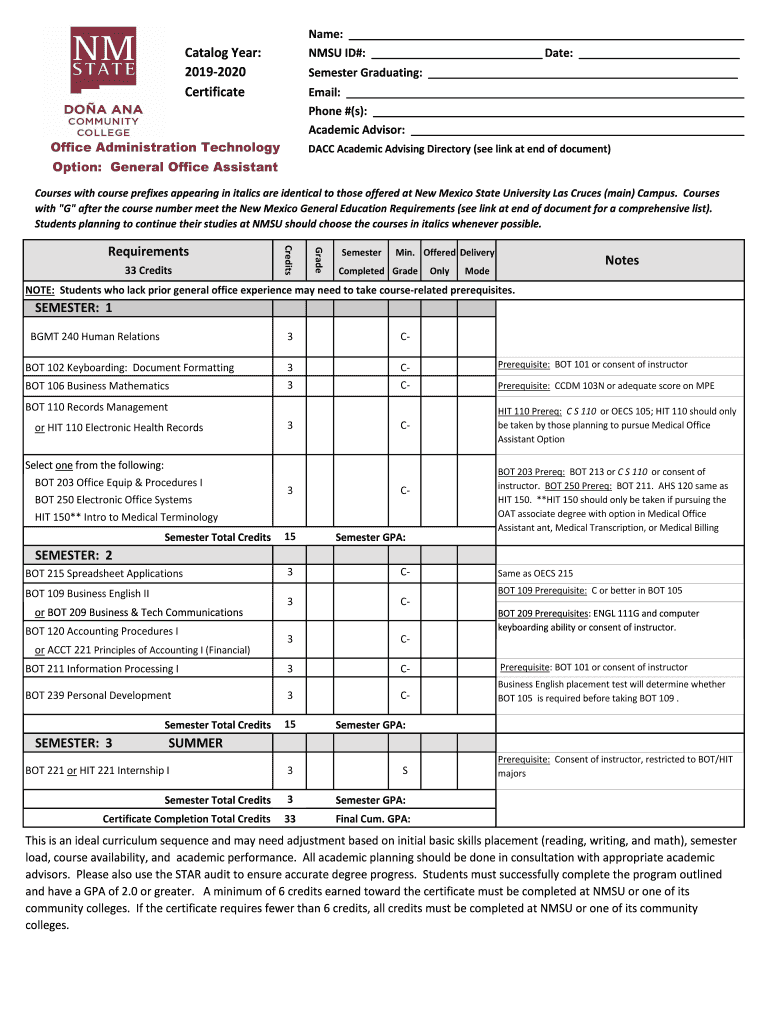 Name: MSU ID#: Date: Catalog Year: 20192020 CertificateSemester Graduating: Email: Phone #(s): Academic Advisor: Office Administration TechnologyDACC Academic Advising Directory (see link at end of