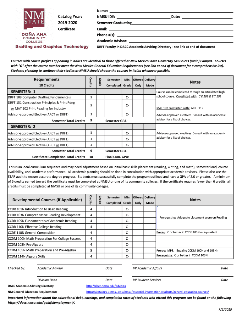 Name: MSU ID#: Date: Catalog Year: 20192020Semester Graduating: CertificateEmail: Phone #(s): Academic Advisor: Drafting and Graphics TechnologyDRFT Faculty in DAC Academic Advising Directory see