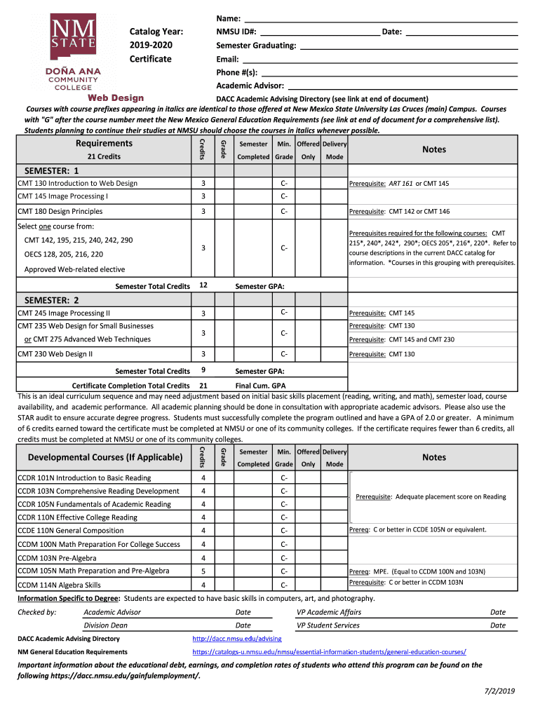 Name: MSU ID#: Date: Catalog Year: 20192020 CertificateSemester Graduating: Email: Phone #(s): Academic Advisor: Web Design DAC Academic Advising Directory (see link at end of document) Courses with