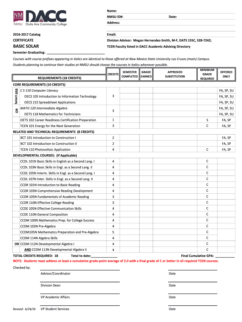 Name: MSU ID#:Date:Address: 20162017 CatalogEmail:CERTIFICATEDivision Advisor: Megan Hernandez Smith, MF, DAYS 155C, 5287242;BASIC SOLACE Faculty listed in DAC Academic Advising DirectorySemester