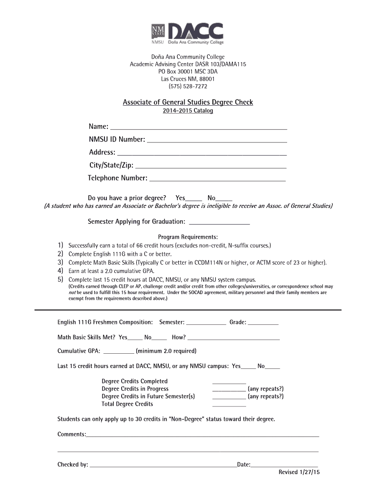 DOA Ana Community College Academic Advising Center DASH 103/DAMA115 PO Box 30001 MSC 3DA Las Cruces NM, 88001 (575) 5287272Associate of General Studies Degree Check 20142015 Catalogize: MSU ID Number: