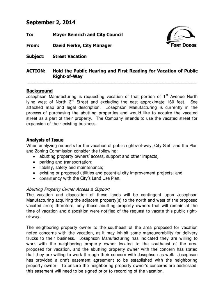 To:Mayor Erich and City Councilor:David Fierce, City ManagerSubject:Street VacationACTION:Hold the Public Hearing and First Reading for Vacation of Public