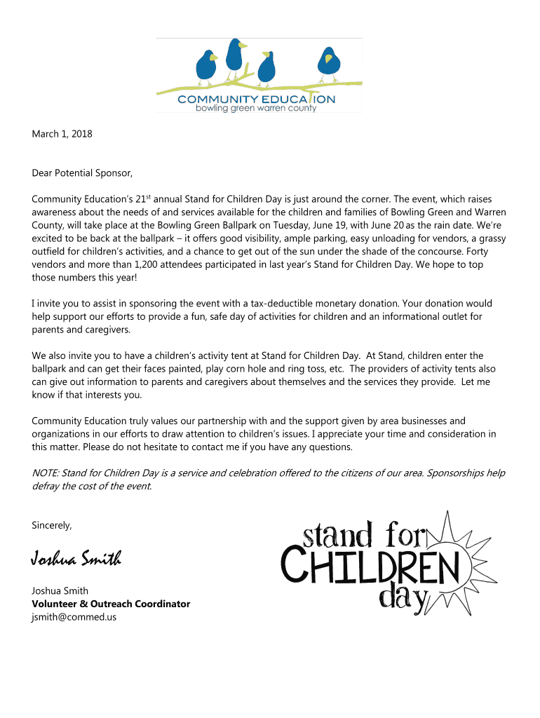 March 1, 2018Dear Potential Sponsor, Community Educations 21st annual Stand for Children Day is just around the corner. The event, which raises awareness about the needs of and services available