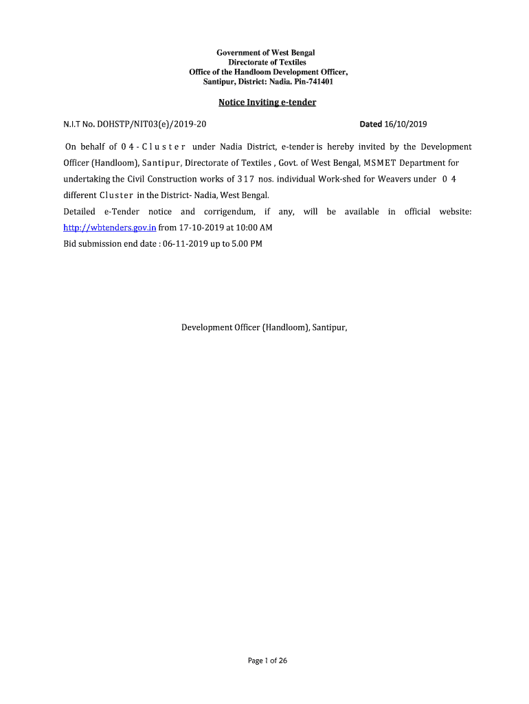 Government of West Bengal Directorate of Textiles Office of the Hand loom Development Officer, Manipur, District: Nadia. Pin741401Notice Inviting tender Dated 16/10/2019 N. I’T No. DOH STP/NIT03(e)/201920On
