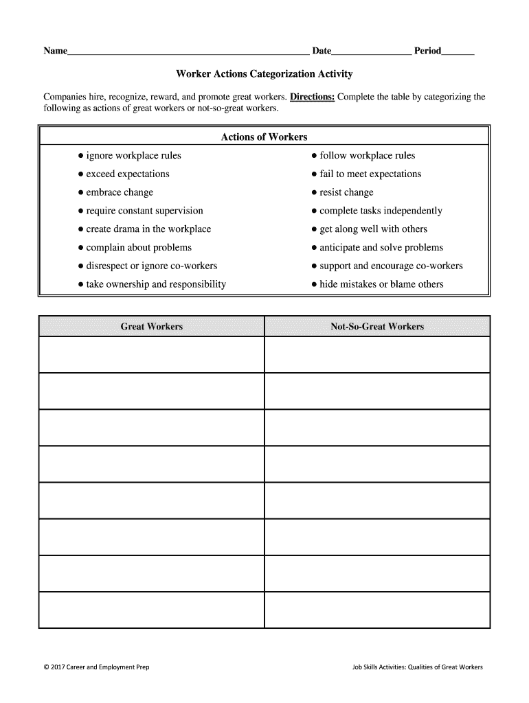 Name Date Period Worker Actions Categorization Activity Companies hire, recognize, reward, and promote great workers. Directions: Complete the table by categorizing the following as actions of great