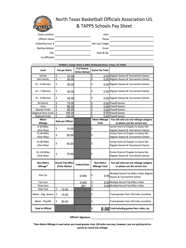 North Texas Basketball Officials Association UIL & TAPES Schools Pay Sheet Game Location:Date:Official's NamePhoneArbiterPay Acct. #SS#: Last 4 DigitsMailing Address:Email:City:State & Zip:Co-official(s)Level