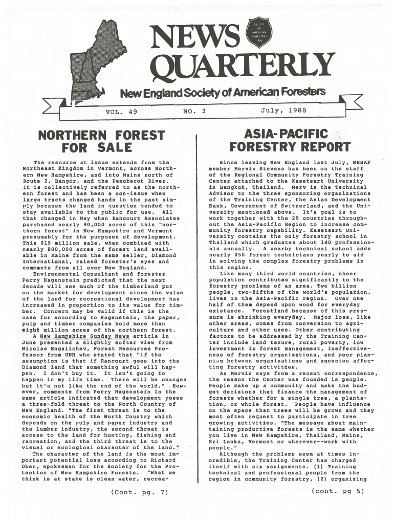 SeQUARTERLYNew England Society of American Foresters.; “), July 1988 NO. 3 VOL. 49NORTHERN FOREST FOR SALE The resource at issue extends from the Northeast Kingdom in Vermont, across Northern New