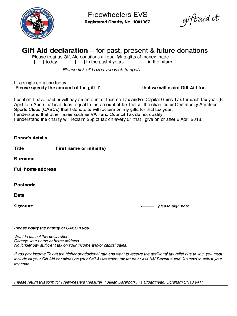 Freewheels EVS Registered Charity No. 1001067Gift Aid declaration for past, present & future donations Please treat as Gift Aid donations all qualifying gifts of money made today in the past 4 years