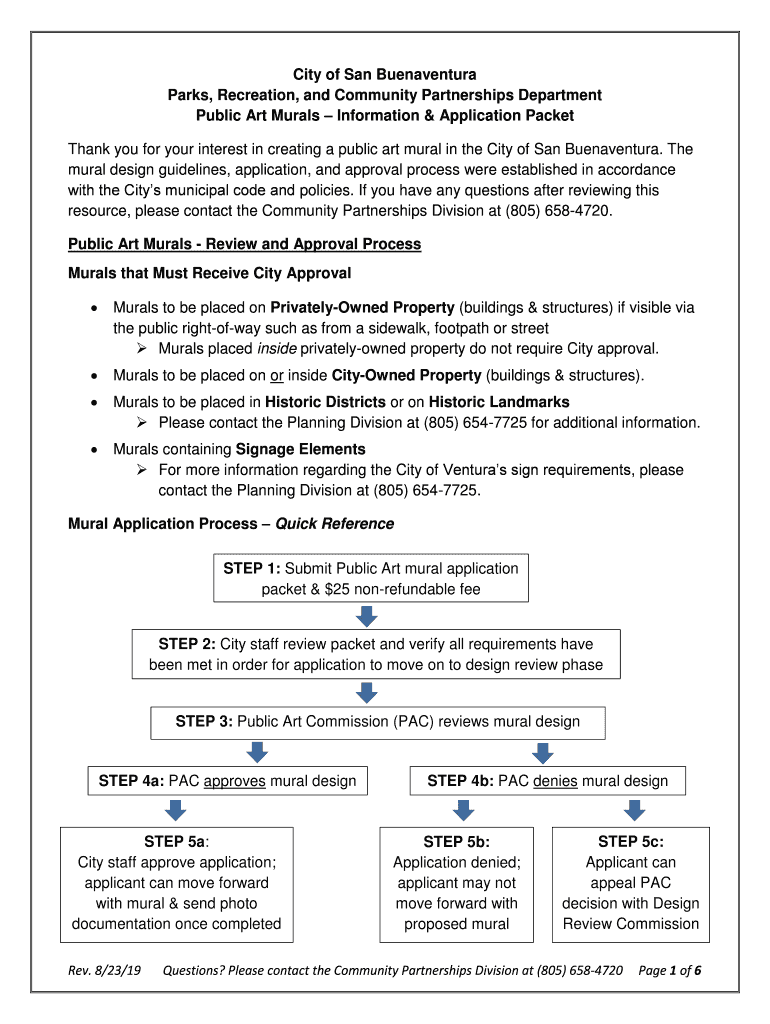 City of San Buenaventura Parks, Recreation, and Community Partnerships Department Public Art Murals Information & Application Packet Thank you for your interest in creating a public art mural in the