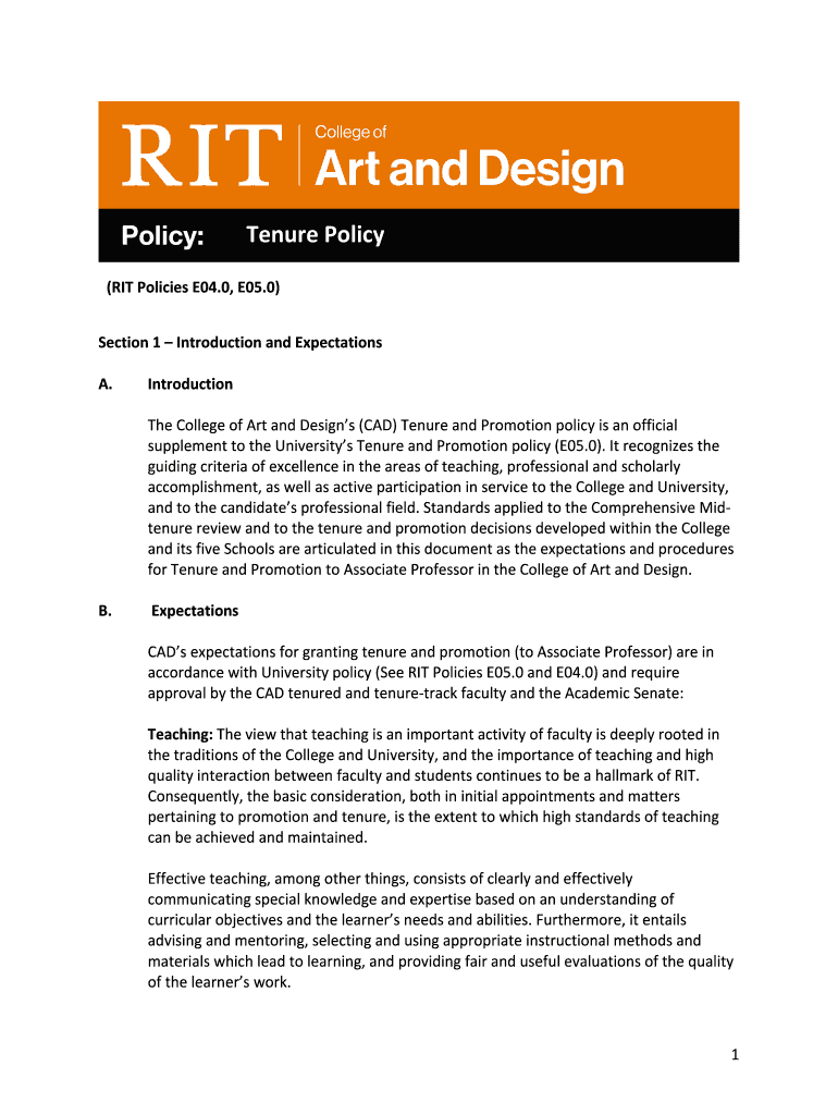 Tenure Policy (IT Policies E04.0, E05.0) Section 1 Introduction and Expectations A. Introduction The College of Art and Designs (CAD) Tenure and Promotion policy is an official supplement to the Universities