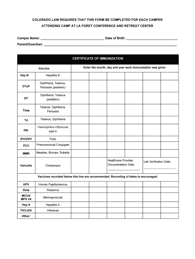 COLORADO LAW REQUIRES THAT THIS FORM BE COMPLETED FOR EACH CAMPER ATTENDING CAMP AT LA FOREST CONFERENCE AND RETREAT CENTERCamper Name: Date of Birth: Parent/Guardian: CERTIFICATE OF IMMUNIZATION