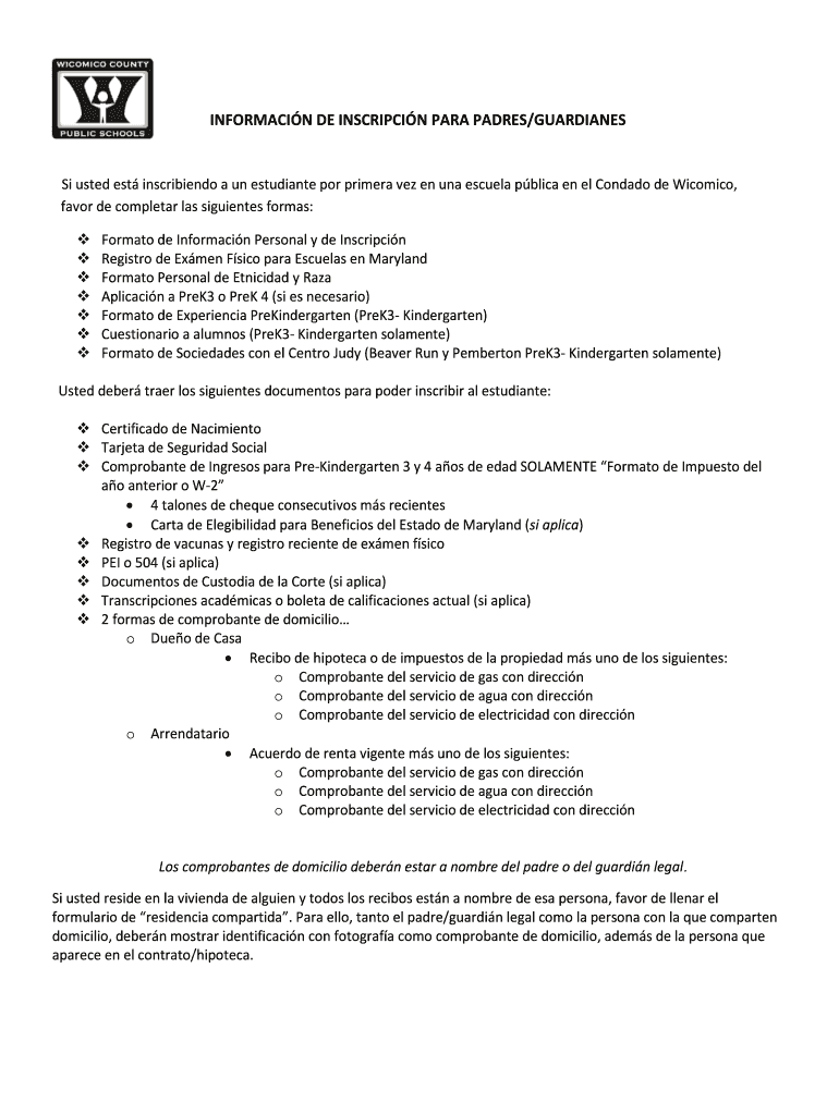 INFORMATION DE INSCRIPTION PARA PADRES/GUARDIANS Si used est inscribed an un estudiante POR primer ve zen RNA Estela public en el Condado de Wicomico, favor DE completer leis migraines format: Format