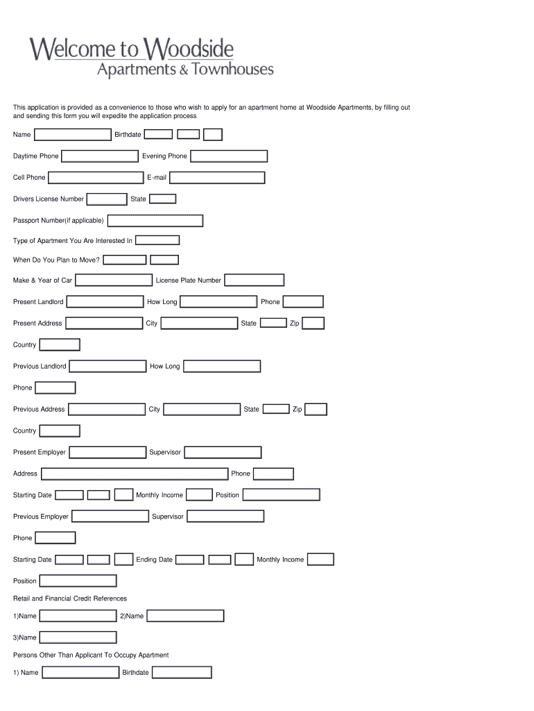 This application is provided as a convenience to those who wish to apply for an apartment home at Woodside Apartments, by filling out and sending this form you will expedite the application process