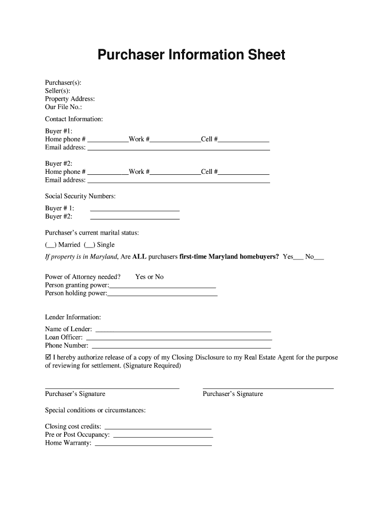 Purchaser Information Sheet Purchaser(s): Seller(s): Property Address: Our File No.: Contact Information: Buyer #1: Home phone # Work # Cell # Email address: Buyer #2: Home phone # Work # Cell # Email