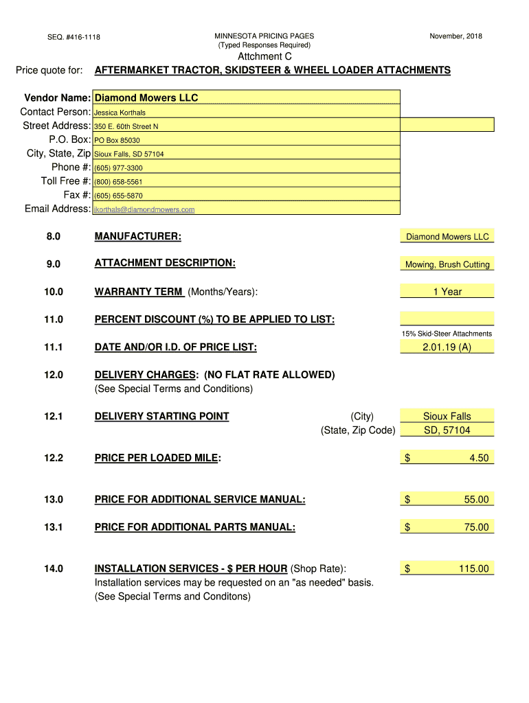 SEQ. #4161118Price quote for:MINNESOTA PRICING PAGES (Typed Responses Required)November, 2018Attchment C AFTERMARKET TRACTOR, SISTER & WHEEL LOADER ATTACHMENTSVendor Name: Diamond Mowers LLC Contact